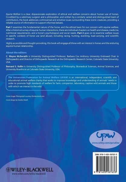 Bernard E. Rollin is University Distinguished Professor of Philosophy, Biomedical Sciences, Animal Sciences, and University Bioethicist at Colorado State University, USA. C. Wayne McIlwraith is University Distinguished Professor, Barbara Cox Anthony University Endowed Chair in Orthopedics and Director of Orthopaedic Research at the Orthopaedic Research Center, Colorado State University, USA. The Universities Federation for Animal Welfare (UFAW) is an internationally recognised, independent, scientific and educational animal welfare charity concerned with improving knowledge and understanding of animals' needs in order to promote high standards of welfare for farm, companion, laboratory, captive wild animals and those with which we interact in the wild.