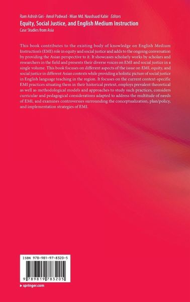 This book contributes to the existing body of knowledge on English Medium Instruction's (EMI) role in equity and social justice and adds to the ongoing conversation by providing the Asian perspective to it. It showcases scholarly works by scholars and researchers in the field and presents their diverse voices on EMI and social justice in a single volume. This book focuses on different aspects of the issue on EMI, equity, and social justice in different Asian contexts while providing a holistic picture of social justice in English language teaching in the region. It focuses on the current context-specific EMI practices situating them in their historical pretext, employs prevalent theoretical as well as methodological models and approaches to study such practices, considers curricular and pedagogical considerations adapted to address the multitude of needs of EMI, and examines controversies surrounding the conceptualization, plan/policy, and implementation strategies of EMI.