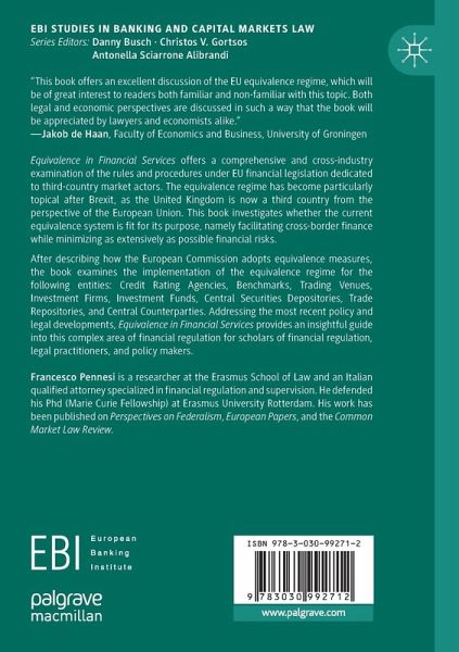 Equivalence in Financial Services offers a comprehensive and cross-industry examination of the rules and procedures under EU financial legislation dedicated to third-country market actors. The equivalence regime has become particularly topical after Brexit, as the United Kingdom is now a third country from the perspective of the European Union. This book investigates whether the current equivalence system is fit for its purpose, namely facilitating cross-border finance while minimizing as extensively as possible financial risks.