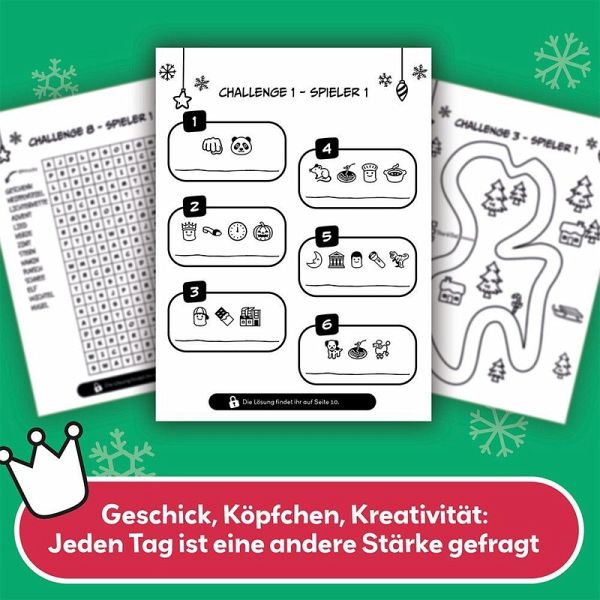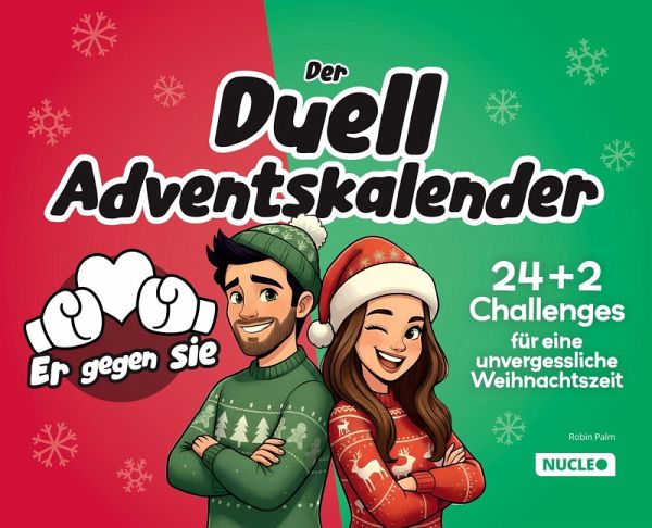 Macht die Adventszeit gemeinsam unvergesslich Dieser Adventskalender für Paare bringt euch 24 tolle Momente zu zweit - und zu den Weihnachtstagen gibt es zwei Extra-Türchen. Challenges und Duelle Tretet jeden Tag in einem spannenden Duell gegeneinander an. Wer von euch ist geschickter? Wer kann mehr Rätsel knacken? Die Challenges sind abwechslungsreich - jede Stärke ist gefragt. Gemeinsame Zeit ist das wertvollste Geschenk Dieser Adventskalender wird zu eurem (romantischen) Ritual: Freut euch jeden Tag auf eine neue Challenge und verbringt kostbare Augenblicke zu zweit. Spiel, Spaß und Challenges Wer am Ende die meisten Siege einfährt, darf sich ein Extra-Geschenk vom Partner wünschen. So bleibt es bis Weihnachten spannend. Highlights: Verbringt gemeinsam Zeit und freut euch täglich auf ein spannendes Duell Geschick, Köpfchen, Kreativität: Jeden Tag ist eine andere Stärke gefragt Das Geschenk für die Adventszeit - überrascht euren Partner Bonus: Zwei Extra-Challenges für die Weihnachtsfeiertage Das Geschenk für Paare Holt euch jetzt diesen Adventskalender für eine wunderschöne Weihnachtszeit - und findet heraus, wer in den lustigen Duellen als Sieger hervorgeht.