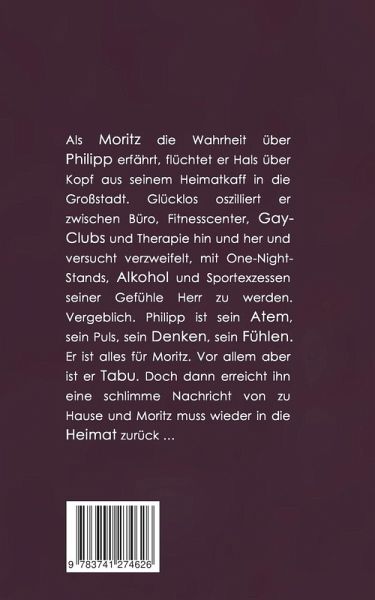Als Moritz die Wahrheit über Philipp erfährt, flüchtet er Hals über Kopf aus seinem Heimatkaff in die Großstadt. Glücklos oszilliert er zwischen Büro, Fitnesscenter, Gay-Clubs und Therapie hin und her und versucht verzweifelt, mit One-Night-Stands, Alkohol und Sportexzessen seiner Gefühle Herr zu werden. Vergeblich. Philipp ist sein Atem, sein Puls, sein Denken, sein Fühlen. Er ist alles für Moritz. Vor allem aber ist er Tabu. Doch dann erreicht ihn eine schlimme Nachricht von zu Hause und Moritz muss wieder in die Heimat zurück ...