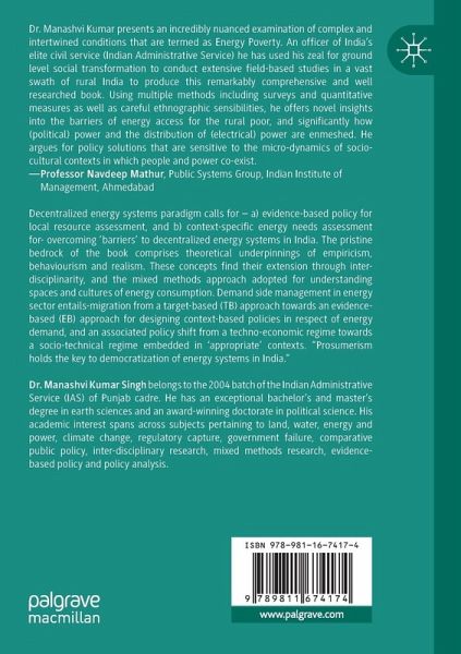 Decentralized energy systems paradigm calls for - a) evidence-based policy for local resource assessment, and b) context-specific energy needs assessment for- overcoming 'barriers' to decentralized energy systems in India. The pristine bedrock of the book comprises theoretical underpinnings of empiricism, behaviourism and realism. These concepts find their extension through inter-disciplinarity, and the mixed methods approach adopted for understanding spaces and cultures of energy consumption. Demand side management in energy sector entails-migration from a target-based (TB) approach towards an evidence-based (EB) approach for designing context-based policies in respect of energy demand, and an associated policy shift from a techno-economic regime towards a socio-technical regime embedded in 'appropriate' contexts. "Prosumerism holds the key to democratization of energy systems in India."