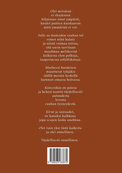 Olet metsässä et eksyksissä hiljaisuus sinut ympäröi, kuulet puitten kuiskaavan niitä ymmärtää et voi. Sulle ne kuitenkin rauhan toi voinet niitä halata ja niistä voimaa toivoa, sitä usein tarvitaan maailman melskeessä kulkiessa elon polkuja, taapertaessa asfalttikatuja. Murheesi huomisen muuttuvat tyhjäksi täällä metsän keskellä luonnon omassa hoivassa. Kiireesikin on poissa ja kehosi nauttii täydellisesti autuudesta levosta rauhan tyyneydestä. Kivut ja sairaudet ne kauaksi kaikkoaa jopa ecujen lasku unohtuu. Olet vain yksi tästä kaikesta ja olet onnellinen. Täydellisesti onnellinen.