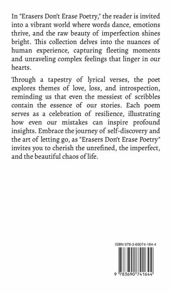 In "Erasers Don't Erase Poetry," the reader is invited into a vibrant world where words dance, emotions thrive, and the raw beauty of imperfection shines bright. This collection delves into the nuances of human experience, capturing fleeting moments and unraveling complex feelings that linger in our hearts. Through a tapestry of lyrical verses, the poet explores themes of love, loss, and introspection, reminding us that even the messiest of scribbles contain the essence of our stories. Each poem serves as a celebration of resilience, illustrating how even our mistakes can inspire profound insights. Embrace the journey of self-discovery and the art of letting go, as "Erasers Don't Erase Poetry" invites you to cherish the unrefined, the imperfect, and the beautiful chaos of life.