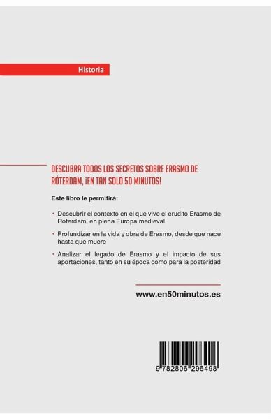 Este libro es una guía práctica y accesible para saber más sobre Erasmo de Róterdam, que le aportará la información esencial y le permitirá ganar tiempo. En tan solo 50 minutos usted podrá: ¿ Entender el contexto en el que se enmarca la vida de Erasmo de Róterdam, entre los siglos XIV y XV en Europa, una época marcada por la recuperación económica tras varias crisis y por el auge del Renacimiento ¿ Analizar la trayectoria vital de Erasmo, desde que nace hasta que muere, profundizando en sus viajes por Europa y en los encuentros con grandes intelectuales que influirán en su amplia producción de obras y en su pensamiento humanista ¿ Examinar las aportaciones de Erasmo a la sociedad de su época, en especial en el ámbito religioso y en el de la Reforma, y su influencia en las corrientes, obras y pensamientos posteriores, así como la lectura que de ellas podemos hacer hoy SOBRE en50MINUTOS.ES   Historia en50MINUTOS.ES le ofrece las claves para entender rápidamente los principales acontecimientos históricos que cambiaron el mundo.  Nuestras obras narran de forma rápida y eficaz una gran variedad de acontecimientos históricos clave de distintas épocas, desde la Antigua Grecia hasta la caída del muro de Berlín. ¡Descubra en un tiempo récord la historia que ha marcado el rumbo del mundo!