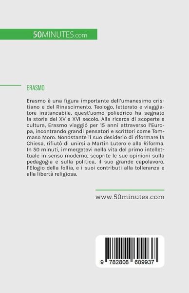 Erasmo è una figura importante dell'umanesimo cristiano e del Rinascimento. Teologo, letterato e viaggiatore instancabile, quest'uomo poliedrico ha segnato la storia del XV e XVI secolo. Alla ricerca di scoperte e cultura, Erasmo viaggiò per 15 anni attraverso l'Europa, incontrando grandi pensatori e scrittori come Tommaso Moro. Nonostante il suo desiderio di riformare la Chiesa, rifiutò di unirsi a Martin Lutero e alla Riforma. In 50 minuti, immergetevi nella vita del primo intellettuale in senso moderno, scoprite le sue opinioni sulla pedagogia e sulla politica, il suo grande capolavoro, l'Elogio della follia, e i suoi contributi alla tolleranza e alla libertà religiosa.