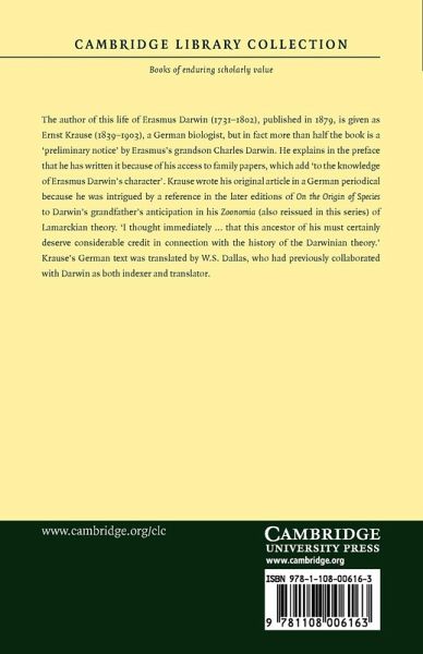 The author of this life of Erasmus Darwin, published in 1879, is given as Ernst Krause (1839-1903) a German biologist, but in fact more than half the book is a 'preliminary notice' by Charles Darwin, who explains in the preface that he has written it because of his access to family papers which add 'to the knowledge of Erasmus Darwin's character'. Krause wrote his original article in a German periodical because, in turn, he was intrigued by a reference made by Charles Darwin in the later editions of On the Origin of Species to his grandfather's anticipation in his Zoonomia (also reissued in this series) of Lamarckian theory: 'I thought immediately ... that this ancestor of his must certainly deserve considerable credit in connection with the history of the Darwinian theory.' The German text was translated by W. S. Dallas, who had previously collaborated with Darwin as both indexer and translator.