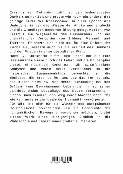 Erasmus von Rotterdam zählt zu den bedeutendsten Denkern seiner Zeit und prägte wie kaum ein anderer das geistige Klima der Renaissance. In einer Epoche des Umbruchs, in der das Wissen der Antike neu entdeckt und die Grundlagen moderner Bildung gelegt wurden, war Erasmus ein Wegbereiter des Humanismus und ein unermüdlicher Verfechter von Bildung, Vernunft und Toleranz. Er setzte sich nicht nur für eine Reform der Kirche ein, sondern auch für die Freiheit des Denkens und den Frieden in einer gespaltenen Welt.Hans G. Burckhardt nimmt den Leser mit auf eine faszinierende Reise durch das Leben und die Philosophie dieses einzigartigen Gelehrten. Mit scharfsinnigen Analysen und einem tiefen Verständnis für die historischen Zusammenhänge beleuchtet er die Einflüsse, die Erasmus formten, und das Vermächtnis, das dieser hinterließ. Von seiner Ausbildung bei den Brüdern vom Gemeinsamen Leben bis hin zu seiner bahnbrechenden Neuauflage des Neuen Testaments - dieses Buch zeichnet den Weg eines Mannes nach, der wie kein anderer die Ideale der Humanität verkörperte.Für alle, die sich für die Wurzeln des europäischen Geisteslebens interessieren und die Geschichte der humanistischen Bewegung verstehen möchten, bietet dieses Werk einen einzigartigen Einblick in die Philosophie und Lehren eines großen Humanisten.