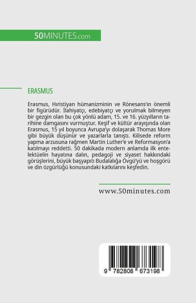 Erasmus, H¿ristiyan hümanizminin ve Rönesans'¿n önemli bir figürüdür. ¿lahiyatç¿, edebiyatç¿ ve yorulmak bilmeyen bir gezgin olan bu çok yönlü adam, 15. ve 16. yüzy¿llar¿n tarihine damgas¿n¿ vurmu¿tur. Ke¿if ve kültür aray¿¿¿nda olan Erasmus, 15 y¿l boyunca Avrupa'y¿ doläarak Thomas More gibi büyük dü¿ünür ve yazarlarla tan¿¿t¿. Kilisede reform yapma arzusuna rämen Martin Luther'e ve Reformasyon'a kat¿lmay¿ reddetti. 50 dakikada modern anlamda ilk entelektüelin hayat¿na dal¿n, pedagoji ve siyaset hakk¿ndaki görü¿lerini, büyük bäyap¿t¿ Budalal¿¿a Övgü'yü ve ho¿görü ve din özgürlü¿ü konusundaki katk¿lar¿n¿ ke¿fedin.