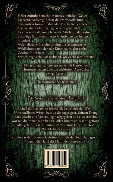 Der bildgewaltige Schauerroman ist der Auftakt zu einer neuen Fantasy-Trilogie. Mit der Vermischung von Fantasy und Horror kehrt der Autor zurück zu den Wurzeln der Phantastik.Erkennen Sie die Realität des Lebens und erleben Sie die bittere Wahrheit über das tragische Schicksal der "Erben der Ewigkeit".KurzbeschreibungHeller Aufruhr herrscht im mittelalterlichen Weiler Laaberau. Aufgeregt fiebert die Bevölkerung dem großen Konzert fahrender Musikanten entgegen. Die Gefahr der letzten Tage scheint gebannt. Doch war der dämonische weiße Säbelzahn der wahre Schuldige für die erfahrenen Gräueltaten der letzten Stunden? Welch düsteres Geheimnis birgt die verwunschene Waldlichtung und der edle Kirschbaum, den uralte Geschöpfe beleben?Schnell zeigt sich, dass nichts ist, wie es zunächst scheint.Ein grausiges Fantasy-Spektakel mit klassischen Horrorelementen über die triebhaften Auswüchse ewigen Lebens.Das Genre des "Phantastischer Schauerroman" - Düstere Grundstimmung - Gruseliges Setting - Unheimliche Begegnungen - Figurengetriebene Haupthandlung mit großen Gefühlen wie Leidenschaft, Dramatik & Begierde. - Keine Unterscheidung in "gut" und "böse" - Häufig mit tragischem EndeZitate aus Erben der Ewigkeit»Stell dir mal vor, du hättest alle Lebenszeit der Welt. Unvorstellbares Wissen hast du dir angeeignet, deinem Drang nach Macht und Vollendung nachgegeben und alles erreicht, wonach du immer gestrebt hast. Allen Interessen hast du gefrönt. Alles gelernt, was du immer schon einmal lernen wolltest. Was bleibt da übrig?«»Entlockst du mir mein Geheimnis, ist dir der Tod schon gewiss durch die Hand des Herrn der Finsternis.«