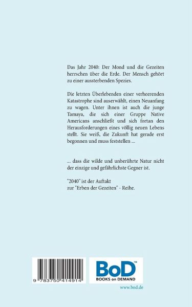 Das Jahr 2040: Der Mond und die Gezeiten herrschen über die Erde. Der Mensch gehört zu einer aussterbenden Spezies.Die letzten Überlebenden einer verheerenden Katastrophe sind auserwählt, einen Neuanfang zu wagen. Unter ihnen ist auch die junge Tamaya, die sich einer Gruppe Native Americans anschließt und sich fortan den Herausforderungen eines völlig neuen Lebens stellt. Sie weiß, die Zukunft hat gerade erst begonnen und muss feststellen, dass die wilde und unberührte Natur nicht der einzige und gefährlichste Gegner ist."2040" ist der Auftakt zur "Erben der Gezeiten" - Reihe.
