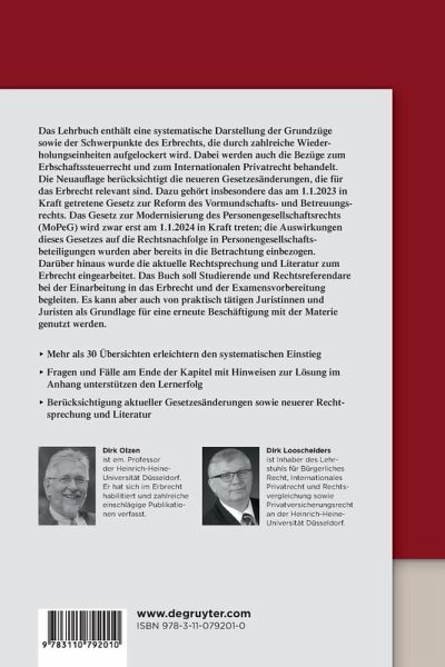 Das Lehrbuch enthält eine systematische Darstellung der Grundzüge sowie der Schwerpunkte des Erbrechts, die durch zahlreiche Wiederholungseinheiten aufgelockert wird. Dabei werden auch die Bezüge zum Erbschaftssteuerrecht und zum Internationalen Privatrecht behandelt. Die Neuauflage berücksichtigt die neueren Gesetzesänderungen, die für das Erbrecht relevant sind. Dazu gehört insbesondere das am 1.1.2023 in Kraft getretene Gesetz zur Reform des Vormundschafts- und Betreuungsrechts. Das Gesetz zur Modernisierung des Personengesellschaftsrechts (MoPeG) wird zwar erst am 1.1.2024 in Kraft treten; die Auswirkungen dieses Gesetzes auf die Rechtsnachfolge in Personengesellschaftsbeteiligungen wurden aber bereits in die Betrachtung einbezogen. Darüber hinaus wurde die aktuelle Rechtsprechung und Literatur zum Erbrecht eingearbeitet. Das Buch soll Studierende und Rechtsreferendare bei der Einarbeitung in das Erbrecht und der Examensvorbereitung begleiten. Es kann aber auch von praktisch tätigen Juristinnen und Juristen als Grundlage für eine erneute Beschäftigung mit der Materie genutzt werden.