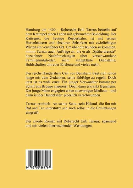 Hamburg um 1400. Roberecht Erik Tarnus betreibt auf dem Kattrepel einen Laden mit gebrauchter Bekleidung. Der Kattrepel, die heutige Reeperbahn, ist mit seinen Hurenhäusern und obskuren Schänken mit zwielichtigen Wirten ein verrufener Ort. Um über die Runden zu kommen, nimmt Tarnus auch Aufträge an, die er als "Späherdienste" bezeichnet: Nachforschungen über verschwundene Familienmitglieder, nicht aufgeklärte Diebstähle, Buhlschaften untreuer Eheleute und vieles mehr. Der reiche Handelsherr Carl von Bensheim trägt sich schon lange mit dem Gedanken, seine Erbfolge zu regeln. Doch jetzt ist es wohl ernst: Ein junger Verwandter kommt per Schiff aus Brügge angereist. Doch dann erkrankt Bensheim. Der junge Mann engagiert einen auswärtigen Medicus - und dann ist der Handelsherr plötzlich verschwunden.Tarnus ermittelt. An seiner Seite steht Hiltrud, die ihn mit Rat und Tat unterstützt und auch selbst in die Ermittlungen eingreift.Der zweite Roman mit Roberecht Erik Tarnus, spannend und mit vielen überraschenden Wendungen.