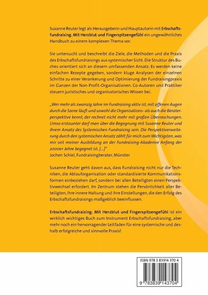 Susanne Reuter legt als Herausgeberin und Hauptautorin ein ungewöhnliches Handbuch zu einem komplexen Thema vor. Sie untersucht und beschreibt die Ziele, die Methoden und die Praxis des Erbschaftsfundraisings aus systemischer Sicht. Die Struktur des Buches orientiert sich an diesem umfassenden Ansatz. Es werden keine einfachen Rezepte gegeben, sondern kluge Analysen der einzelnen Schritte zu einer Verankerung und Optimierung der Fundraisingpraxis im Ganzen der Non-Profit-Organisationen. "Wer mehr als zwanzig Jahre im Fundraising aktiv ist, mit offenen Augen durch die Szene läuft, sich um Weiterbildung bemüht und sowohl die Organisations- als auch die Beraterperspektive kennt, der rechnet nicht mehr mit großen Überraschungen. Umso erstaunter darf man über die Begegnung mit Susanne Reuter und ihrem Ansatz des Systemischen Fundraising sein. Die Perspektiverweiterung durch den systemischen Ansatz zählt für mich zum Wichtigsten, was mir seit meiner Ausbildung an der Fundraising-Akademie Anfang der 2000er Jahre begegnet ist. Es ist müßig zu spekulieren, warum sich die deutsche Fundraisingszene dem systemischen Ansatz bisher nur zögerlich nähert. Aber dies mag erklären, warum Susanne Reuter die erste Grundlegung ihres Ansatzes gleichsam "undercover" in einem Buch zu einem speziellen Fundraising-Instrument versteckt hat. Doch das Systemische Fundraising verdient jede Aufmerksamkeit, denn - schlicht und ergreifend - es wirkt!" Jochen SchielSusanne Reuter geht davon aus, dass Fundraising nicht nur die Techniken, die Ablauforganisation oder standardisierte Kommunikationsformen einbeziehen darf, sondern bei allen Beteiligten einen Perspektivwechsel erfordert. Im Zentrum stehen die Persönlichkeit aller Beteiligten, ihre innere Haltung und ihre Einstellungen, die den Erfolg des Erbschaftsfundraisings maßgeblich beeinflussen. Wie muss die eigene Organisation beschaffen sein, um erfolgreich Fundraising betreiben zu können? Welche Visionen, Leitbilder und Werte spiele eine Rolle? Wer trägt innerhalb der Organisation diese Leitbilder und treibt ihre Verankerung voran? Entlang dieser Fragen entwickelt Susanne Reuter ihren systemischen, ganzheitlichen Ansatz. Co-Autoren und Praktiker steuern juristisches und organisatorisches Wissen bei.Mit Beiträgen von: Dr. Helmut Blanke, Paul Dalby, Klaus Heil, Dr. Bertold Höcker, Rechtsanwalt Marcus Kreutz, Prof. Dr. Wolfgang Nethöfel, Dr. Martin Thomé