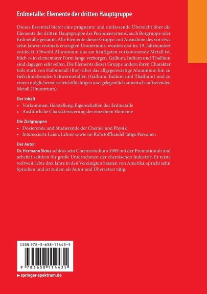 Dieses Essential bietet eine prägnante und umfassende Übersicht über die Elemente der dritten Hauptgruppe des Periodensystems, auch Borgruppe oder Erdmetalle genannt. Alle Elemente dieser Gruppe, mit Ausnahme des vor etwa zehn Jahren erstmals erzeugten Ununtriums, wurden erst im 19. Jahrhundert entdeckt. Obwohl Aluminium das am häufigsten vorkommende Metall ist, blieb es in elementarer Form lange verborgen. Gallium, Indium und Thallium sind dagegen sehr selten. Die Elemente dieser Gruppe ändern ihren Charakter teils stark von Halbmetall (Bor) über das allgegenwärtige Aluminium hin zu tiefschmelzenden Schwermetallen (Gallium, Indium und Thallium) und zu einem möglicherweise leichtflüchtigen und gelegentlich anionisch auftretenden Metall (Ununtrium).