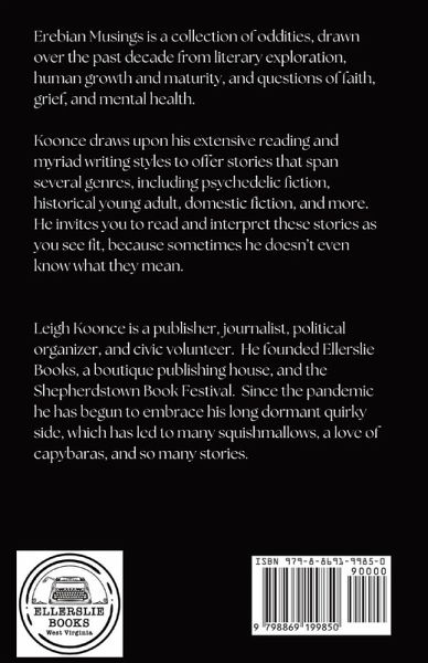 Erebian Musings is a collection of oddities, drawn over the past decade from literary exploration, human growth and maturity, and questions of faith, grief, and mental health. Koonce draws upon his extensive reading and myriad writing styles to offer stories that span several genres, including psychedelic fiction, historical young adult, domestic fiction, and more. He invites you to read and interpret these stories as you see fit, because sometimes he doesn't even know what they mean.