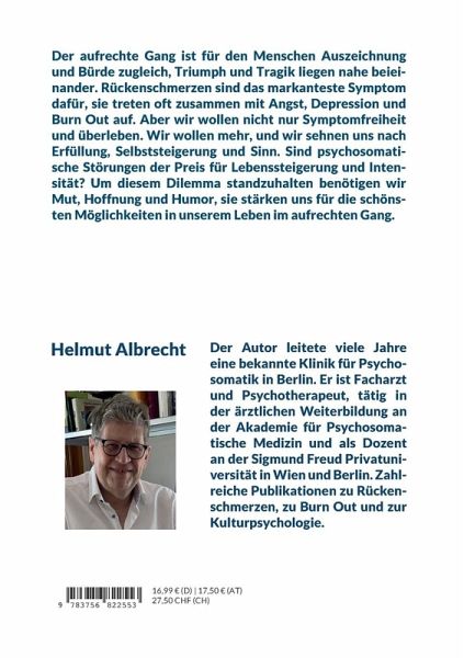 Der aufrechte Gang ist für den Menschen Auszeichnung und Bürde zugleich. Selbst bei hervorragenden Repräsentanten der Kultur wie Alfred Adler, Frida Kahlo und Gustav Klimt liegen Triumph und Tragik nahe beieinander. Rückenschmerzen sind das markanteste Symptom für das Auf und Ab im aufrechten Gang. Sie treten nicht zufällig häufig mit pathologischer Angst, Depressionen und Burn Out auf.Wir wollen im Leben mehr als Überleben und Symptomfreiheit. Wir sehnen uns nach Erfüllung, Selbststeigerung und Sinn. Sind unsere psychosomatischen Symptome der Preis dafür, wenn wir an unsere Grenzen kommen? Wir benötigen Mut, Hoffnung und Humor um den Weg weiter im aufrechten Gang zu bewältigen