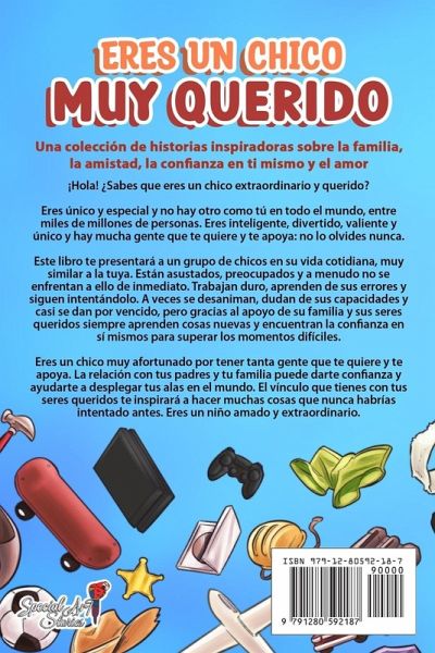 ¡Hola! ¿Sabes que eres un chico extraordinario y querido? Eres único y especial y no hay otro como tú en todo el mundo, entre miles de millones de personas. Eres inteligente, divertido, valiente y único y hay mucha gente que te quiere y te apoya: no lo olvides nunca. Este libro te presentará a un grupo de chicos en su vida cotidiana, muy similar a la tuya. Están asustados, preocupados y a menudo no se enfrentan a ello de inmediato. Trabajan duro, aprenden de sus errores y siguen intentándolo. A veces se desaniman, dudan de sus capacidades y casi se dan por vencido, pero gracias al apoyo de su familia y sus seres queridos siempre aprenden cosas nuevas y encuentran la confianza en sí mismos para superar los momentos difíciles. Eres un chico muy afortunado por tener tanta gente que te quiere y te apoya. La relación con tus padres y tu familia puede darte confianza y ayudarte a desplegar tus alas en el mundo. El vínculo que tienes con tus seres queridos te inspirará a hacer muchas cosas que nunca habrías intentado antes. Eres un niño amado y extraordinario. Lo que encontrarás en este libro: 10 historias inspiradoras para niños sobre la familia, la amistad, la confianza en ti misma y el amor Un estilo de escritura sencillo y atractivo, adecuado tanto para la lectura compartida como para la independiente La identificación con los personajes, que siempre se combinan con temas de la vida real de los niños Bellas imágenes para acompañar la lectura y estimular la imaginación Moral y mensajes de la vida con reflexiones y participación en la narración A los niños les encanta este libro porque les ayuda a: Comprender la importancia de las relaciones con los padres y los amigos Desarrollar la confianza en sí mismos y en sus capacidades Afrontar mejor las situaciones difíciles Nunca rendirse y no desanimarse por los pequeños fracasos Ser curiosos y seguir sus pasiones 2 Regalos para ti que puedes descargar del sitio web de Special Art: Diario de los sueños de los niños (PDF) Frases motivadoras para colorear para niños (PDF) Haz clic en "comprar ahora" y ayuda a que un niño mejorar su autoestima y creer en sí mismo. (Una idea de regalo perfecta)