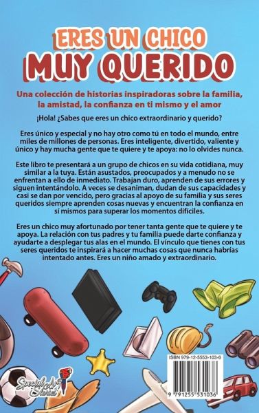 ¡Hola! ¿Sabes que eres un chico extraordinario y querido? Eres único y especial y no hay otro como tú en todo el mundo, entre miles de millones de personas. Eres inteligente, divertido, valiente y único y hay mucha gente que te quiere y te apoya: no lo olvides nunca. Este libro te presentará a un grupo de chicos en su vida cotidiana, muy similar a la tuya. Están asustados, preocupados y a menudo no se enfrentan a ello de inmediato. Trabajan duro, aprenden de sus errores y siguen intentándolo. A veces se desaniman, dudan de sus capacidades y casi se dan por vencido, pero gracias al apoyo de su familia y sus seres queridos siempre aprenden cosas nuevas y encuentran la confianza en sí mismos para superar los momentos difíciles. Eres un chico muy afortunado por tener tanta gente que te quiere y te apoya. La relación con tus padres y tu familia puede darte confianza y ayudarte a desplegar tus alas en el mundo. El vínculo que tienes con tus seres queridos te inspirará a hacer muchas cosas que nunca habrías intentado antes. Eres un niño amado y extraordinario. Lo que encontrarás en este libro: 10 historias inspiradoras para niños sobre la familia, la amistad, la confianza en ti misma y el amor Un estilo de escritura sencillo y atractivo, adecuado tanto para la lectura compartida como para la independiente La identificación con los personajes, que siempre se combinan con temas de la vida real de los niños Bellas imágenes para acompañar la lectura y estimular la imaginación Moral y mensajes de la vida con reflexiones y participación en la narración A los niños les encanta este libro porque les ayuda a: Comprender la importancia de las relaciones con los padres y los amigos Desarrollar la confianza en sí mismos y en sus capacidades Afrontar mejor las situaciones difíciles Nunca rendirse y no desanimarse por los pequeños fracasos Ser curiosos y seguir sus pasiones 2 Regalos para ti que puedes descargar del sitio web de Special Art: Diario de los sueños de los niños (PDF) Frases motivadoras para colorear para niños (PDF) Haz clic en ""comprar ahora"" y ayuda a que un niño mejorar su autoestima y creer en sí mismo. (Una idea de regalo perfecta)