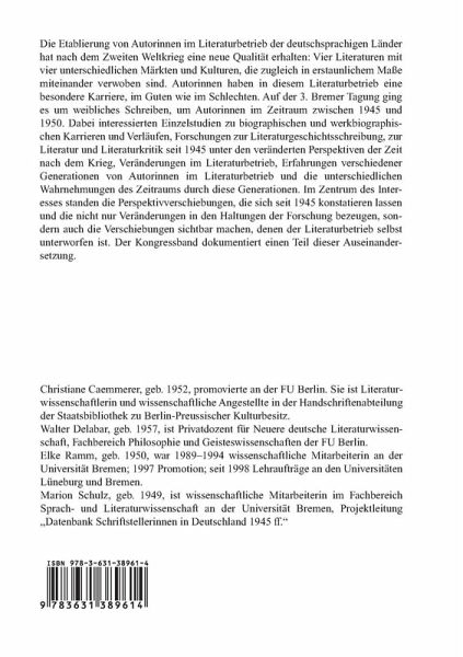 Die Etablierung von Autorinnen im Literaturbetrieb der deutschsprachigen Länder hat nach dem Zweiten Weltkrieg eine neue Qualität erhalten: Vier Literaturen mit vier unterschiedlichen Märkten und Kulturen, die zugleich in erstaunlichem Maße miteinander verwoben sind. Autorinnen haben in diesem Literaturbetrieb eine besondere Karriere, im Guten wie im Schlechten. Auf der 3. Bremer Tagung ging es um weibliches Schreiben, um Autorinnen im Zeitraum zwischen 1945 und 1950. Dabei interessierten Einzelstudien zu biographischen und werkbiographischen Karrieren und Verläufen, Forschungen zur Literaturgeschichtsschreibung, zur Literatur und Literaturkritik seit 1945 unter den veränderten Perspektiven der Zeit nach dem Krieg, Veränderungen im Literaturbetrieb, Erfahrungen verschiedener Generationen von Autorinnen im Literaturbetrieb und die unterschiedlichen Wahrnehmungen des Zeitraums durch diese Generationen. Im Zentrum des Interesses standen die Perspektivverschiebungen, die sich seit 1945 konstatieren lassen und die nicht nur Veränderungen in den Haltungen der Forschung bezeugen, sondern auch die Verschiebungen sichtbar machen, denen der Literaturbetrieb selbst unterworfen ist. Der Kongressband dokumentiert einen Teil dieser Auseinandersetzung.