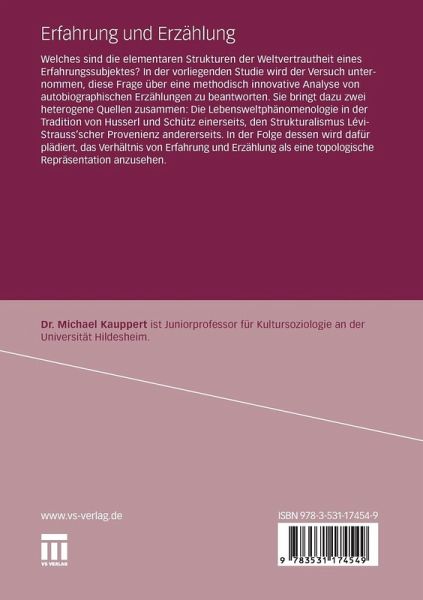 Welches sind die elementaren Strukturen der Weltvertrautheit eines Erfahrungssubjektes? In der vorliegenden Studie wird der Versuch unternommen, diese Frage über eine methodisch innovative Analyse von autobiographischen Erzählungen zu beantworten. Sie bringt dazu zwei heterogene Quellen zusammen: Die Lebensweltphänomenologie in der Tradition von Husserl und Schütz einerseits, den Strukturalismus Lévi-Strauss'scher Provenienz andererseits. In der Folge dessen wird dafür plädiert, das Verhältnis von Erfahrung und Erzählung als eine topologische Repräsentation anzusehen.