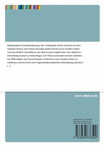 Die vorliegende Arbeit entstand aus dem Anliegen heraus, sich einem derzeitig starken Trend in der Sozialen Arbeit wissenschaftlich anzunähern, und diesen nach eingehender und objektiver Darstellung kritisch zu hinterfragen. Der Trend, konstruktivistische Anleihen aus Philosophie und Neurobiologie zusehends in der Sozialen Arbeit zu etablieren, wird in Form einer logisch-philosophischen Abhandlung diskutiert.