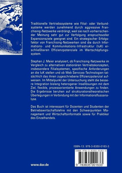 Stephan J. Meier analysiert, ob Franchising-Netzwerke im Vergleich zu alternativen stationären Vertriebskonzepten, insbesondere Filialsystemen, spezifische Anforderungen an die IuK stellen und ob Web Services-Technologien tatsächlich das ihnen zugeschriebene Effizienzpotenzial aufweisen.