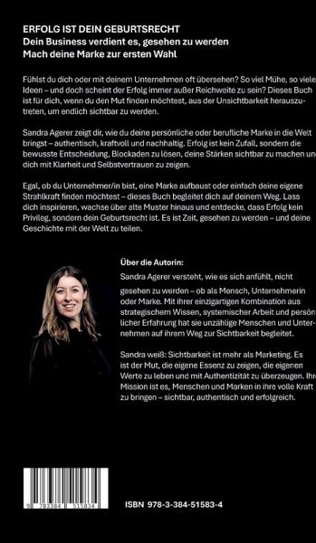 ERFOLG IST DEIN GEBURTSRECHTDein Business verdient es, gesehen zu werden Mach deine Marke zur ersten WahlFühlst du dich oder mit deinem Unternehmen oft übersehen? So viel Mühe, so viele Ideen - und doch scheint der Erfolg immer außer Reichweite zu sein? Dieses Buch ist für dich, wenn du den Mut finden möchtest, aus der Unsichtbarkeit herauszu- treten, um endlich sichtbar zu werden.Sandra Agerer zeigt dir, wie du deine persönliche oder berufliche Marke in die Welt bringst - authentisch, kraftvoll und nachhaltig. Erfolg ist kein Zufall, sondern die bewusste Entscheidung, Blockaden zu lösen, deine Stärken sichtbar zu machen und dich mit Klarheit und Selbstvertrauen zu zeigen.Egal, ob du Unternehmer/in bist, eine Marke aufbaust oder einfach deine eigene Strahlkraft finden möchtest - dieses Buch begleitet dich auf deinem Weg. Lass dich inspirieren, wachse über alte Muster hinaus und entdecke, dass Erfolg kein Privileg, sondern dein Geburtsrecht ist. Es ist Zeit, gesehen zu werden - und deine Geschichte mit der Welt zu teilen.