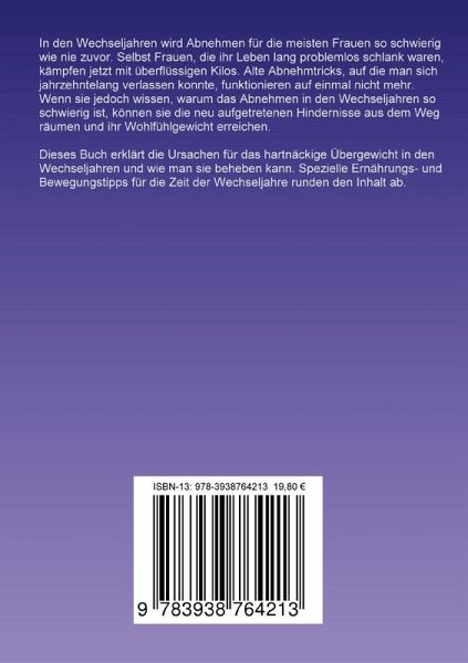 In den Wechseljahren wird Abnehmen für die meisten Frauen so schwierig wie nie zuvor. Selbst Frauen, die ihr Leben lang problemlos schlank waren, kämpfen jetzt mit überflüssigen Kilos. Alte Abnehmtricks, auf die man sich jahrzehntelang verlassen konnte, funktionieren auf einmal nicht mehr. Wenn sie jedoch wissen, warum das Abnehmen in den Wechseljahren so schwierig ist, können sie die neu aufgetretenen Hindernisse aus dem Weg räumen und ihr Wohlfühlgewicht erreichen. Dieses Buch erklärt die Ursachen für das hartnäckige Übergewicht in den Wechseljahren und wie man sie beheben kann. Spezielle Ernährungs- und Bewegungstipps für die Zeit der Wechseljahre runden den Inhalt ab.