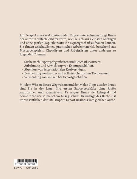 Am Beispiel eines real existierenden Exportunternehmens zeigt Ihnen der Autor in einfach lesbarer Form, wie Sie sich aus kleinsten Anfängen und ohne großen Kapitaleinsatz Ihr Exportgeschäft aufbauen können. Sie finden anschauliches, praktisches Arbeitsmaterial, bestehend aus Musterbeispielen, Checklisten und Arbeitslisten unter anderem zu folgenden Themen: - Suche nach Exportgelegenheiten und Geschäftspartnern, - Anbahnung und Abwicklung von Exportgeschäften, - Abschluss von internationalen Kaufverträgen, - Bearbeitung von finanz- und zollwirtschaftlichen Themen und - Vermeidung von Risiken bei Exportgeschäften. Mit dem Wissen dieses Wegweisers und den vielen Tipps aus der Praxis sind Sie in der Lage, Ihre ersten Exportgeschäfte ohne Risiko anzubahnen und abzuwickeln. Es erspart Ihnen viel Lehrgeld und bewahrt Sie vor so manchem Missgeschick. Grundlage des Buches ist im Wesentlichen der Titel Import-Export Business vom gleichen Autor.Inhaltsverzeichnis Teil I: IhrWeg zum ersten ExportvertragKapitel 1: Von der Vergangenheit in die GegenwartKapitel 2: Erste SchritteKapitel 3: InformationsquellenKapitel 4: Wahl Ihrer HandelswarenKapitel 5: Geschäftspartner und AußenhandelspolitikKapitel 6: Verkauf Ihrer ExportwarenKapitel 7: Von der Anfrage bis zum Kaufvertrag Teil II: Fachwissen zum ExporthandelKapitel 8: Internationales VertragswesenKapitel 9: Lieferbedingungen (Incoterms) Kapitel 10: Transport, Verpackung, VersicherungKapitel 11: TransportdokumenteKapitel 12: Handelsdokumente Kapitel 13: ZahlungsbedingungenKapitel 14: Internationaler ZahlungsverkehrKapitel 15: Finanzierung und ZahlungssicherungKapitel 16: Innergemeinschaftliche WarenverkehrKapitel 17: Zoll - Ausfuhr in Nicht-EU-Staaten