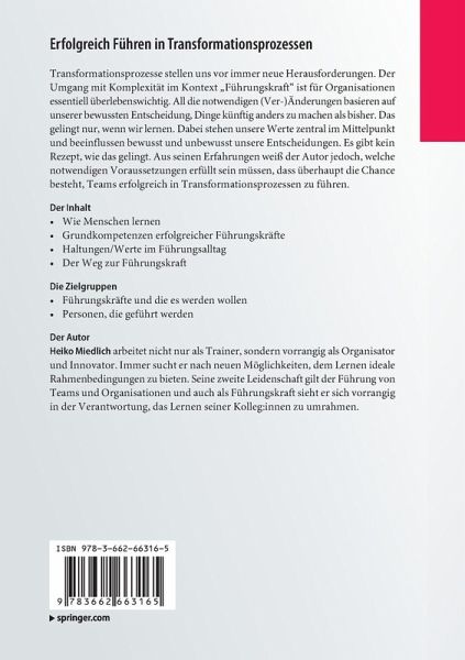 Transformationsprozesse stellen uns vor immer neue Herausforderungen. Der Umgang mit Komplexität im Kontext "Führungskraft" ist für Organisationen essentiell überlebenswichtig. All die notwendigen (Ver )Änderungen basieren auf unserer bewussten Entscheidung, Dinge künftig anders zu machen als bisher. Das gelingt nur, wenn wir lernen. Dabei stehen unsere Werte zentral im Mittelpunkt und beeinflussen bewusst und unbewusst unsere Entscheidungen. Es gibt kein Rezept, wie das gelingt. Aus seinen Erfahrungen weiß der Autor jedoch, welche notwendigen Voraussetzungen erfüllt sein müssen, dass überhaupt die Chance besteht, Teams erfolgreich in Transformationsprozessen zu führen.Den kostenlosen Zugang zum Online-Kurs finden Sie direkt im Buch.