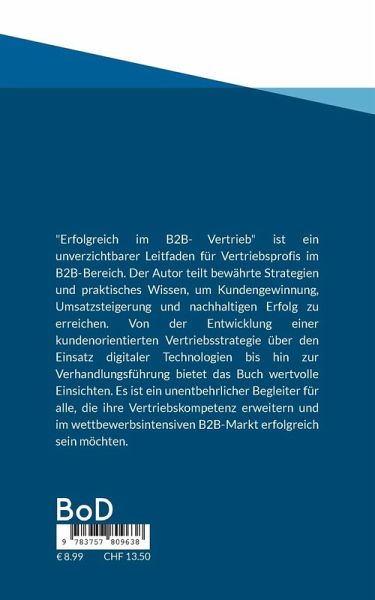 Das eBook "Erfolgreich im B2B-Vertrieb" von Andreas Sawall bietet einen umfassenden Leitfaden für den Erfolg im Business-to-Business-Vertriebsumfeld. Das Buch deckt alle wichtigen Aspekte ab, die Unternehmen im B2B-Bereich berücksichtigen sollten, um ihre Vertriebsstrategien zu optimieren und langfristige Kundenbeziehungen aufzubauen.In Kapitel 1 wird der B2B-Vertrieb eingeführt, seine Besonderheiten und Herausforderungen werden erläutert. Kapitel 2 konzentriert sich auf die Identifizierung der Zielgruppe und die Entwicklung einer klaren Vertriebsstrategie. Kapitel 3 behandelt effektive Vertriebskanäle und deren Integration in die Gesamtstrategie.Kapitel 4 widmet sich dem Vertriebsprozess und gibt praktische Tipps zur Lead-Generierung, Qualifizierung von Interessenten und Abschluss von Geschäften. Kapitel 5 legt den Fokus auf die Kundenbetreuung und den Aufbau langfristiger Beziehungen durch exzellenten Kundenservice und maßgeschneiderte Lösungen.In Kapitel 6 geht es um die Digitalisierung im B2B-Vertrieb und die Nutzung von Technologie und Daten zur Optimierung von Vertriebsstrategien. Kapitel 7 betrachtet den Einsatz von Key Performance Indicators (KPIs) zur Messung und Bewertung des Vertriebserfolgs.Kapitel 8 konzentriert sich auf die Implementierung einer erfolgreichen Digitalstrategie und den Umgang mit dem digitalen Wandel im B2B-Vertrieb. Kapitel 9 legt den Fokus auf Beziehungsmanagement und Kundenbindung als Schlüsselfaktoren für langfristigen Erfolg.Im abschließenden Kapitel 10 wird die Kunst der Verhandlungsführung im B2B-Vertrieb behandelt, einschließlich Tipps zur Vorbereitung, Verhandlungstechniken und dem Umgang mit schwierigen Situationen.Das Buch bietet einen praxisorientierten Ansatz, der von theoretischen Konzepten bis hin zu konkreten Handlungsempfehlungen reicht. Es richtet sich sowohl an Vertriebsprofis als auch an Unternehmer, die ihr Verständnis und ihre Fähigkeiten im B2B-Vertrieb verbessern möchten.Mit fundiertem Fachwissen, praktischen Tipps und realen Beispielen bietet "Erfolgreich im B2B-Vertrieb" wertvolle Einblicke und Anleitungen, um den B2B-Vertrieb zu optimieren, Kunden zu gewinnen und langfristige Geschäftsbeziehungen aufzubauen. Das Buch ist ein unverzichtbarer Begleiter für alle, die im B2B-Vertrieb erfolgreich sein wollen.