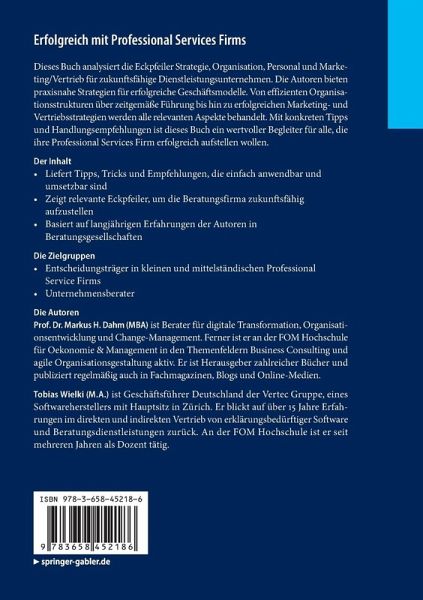 Dieses Buch analysiert die Eckpfeiler Strategie, Organisation, Personal und Marketing/Vertrieb für zukunftsfähige Dienstleistungsunternehmen. Die Autoren bieten praxisnahe Strategien für erfolgreiche Geschäftsmodelle. Von effizienten Organisationsstrukturen über zeitgemäße Führung bis hin zu erfolgreichen Marketing- und Vertriebsstrategien werden alle relevanten Aspekte behandelt. Mit konkreten Tipps und Handlungsempfehlungen ist dieses Buch ein wertvoller Begleiter für alle, die ihre Professional Services Firm erfolgreich aufstellen wollen.