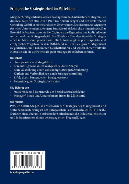 Mit guter Strategiearbeit lässt sich das Ergebnis des Unternehmens steigern - so das Resultat einer Studie von Prof. Dr. Kerstin Seeger und der Performance Consulting GmbH in mittelständischen Unternehmen. Dies ist ein gutes Argument für jedes Unternehmen, die eigene Strategiearbeit kritisch zu hinterfragen. Das Essential liefert Ansatzpunkte hierfür, indem die Ergebnisse der Studie erläutert werden und damit ein ganzheitlicher Überblick über den Stand der Strategiearbeit im Mittelstand gegeben wird. Die Autorin zeigt ein praxiserprobtes und erfolgreiches Vorgehen für den Mittelstand auf, um die eigene Strategiearbeit zu gestalten. Damit bekommen Geschäftsführer und Unternehmer wertvolle Hinweise, wie sie die Potenziale guter Strategiearbeit heben können.