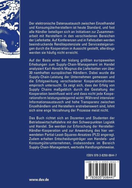 Auf der Basis einer der bislang größten europaweiten Untersuchungen zum Supply-Chain-Management im Handel zeigt Karl-Hendrik Magnus, dass der Erfolg von Supply Chains maßgeblich durch die Gestaltung der Kooperation zwischen Einzelhandel und Herstellern beeinflusst wird und dass nicht jede Kooperationsform leistungssteigernd wirkt: Während intensiver Informationsaustausch und hohe Transparenz erstrebenswert sind, lohnt sich eine enge Verzahnung der Prozesse meist nicht.