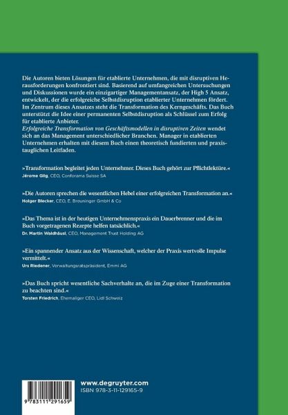 Die Autoren bieten Lösungen für etablierte Unternehmen, die mit disruptiven Herausforderungen konfrontiert sind. Basierend auf umfangreichen Untersuchungen und Diskussionen wurde ein einzigartiger Managementansatz, der High 5 Ansatz, entwickelt, der die erfolgreiche Selbstdisruption etablierter Unternehmen fördert. Im Zentrum dieses Ansatzes steht die Transformation des Kerngeschäfts. Das Buch unterstützt die Idee einer permanenten Selbstdisruption als Schlüssel zum Erfolg für etablierte Anbieter.