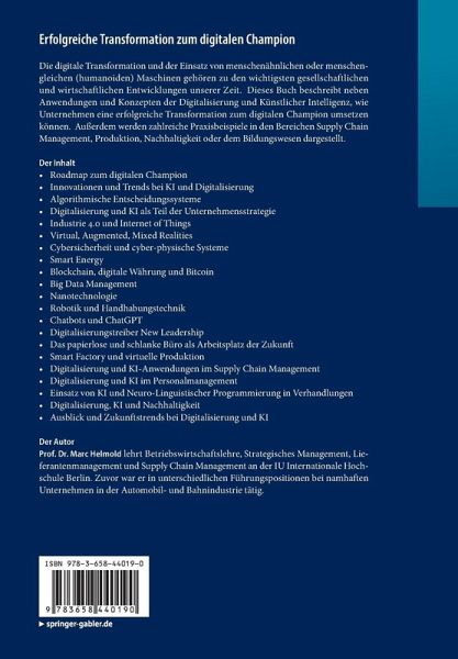 Roadmap zum digitalen Champion.- Innovationen und Trends bei KI und Digitalisierung.- Algorithmische Entscheidungssysteme.- Digitalisierung und KI als Teil der Unternehmensstrategie.- Industrie 4.0 und Internet of Things.- Virtual, Augmented, Mixed Realities - Die Welt der digitalen Realitäten.- Cybersicherheit und cyber-physische Systeme.- Smart Energy: Intelligente Energiekonzepte der Zukunft.- Blockchain, digitale Währung und Bitcoin.- Big Data Management.- Nanotechnologie.- Robotik und Handhabungstechnik.- Chatbots und ChatGPT.- Digitalisierungstreiber New Leadership.- Das papierlose und schlanke Büro als Arbeitsplatz der Zukunft.- Smart Factory und virtuelle Produktion.- Digitalisierung und KI-Anwendungen im Supply Chain Management.- Digitalisierung und KI im Personalmanagement.- Einsatz von KI und Neurolinguistischtes Programmieren in Verhandlungen.- Digitalisierung, KI und Nachhaltigkeit.- Ausblick und Zukunftstrends bei Digitalisierung und KI.