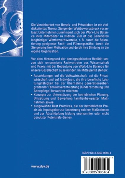 Vor dem Hintergrund der demographischen Realität setzen sich renommierte Fachvertreter aus Wissenschaft und Praxis mit der Bedeutung von Work-Life Balance für unsere Gesellschaft auseinander. Im Mittelpunkt stehen: