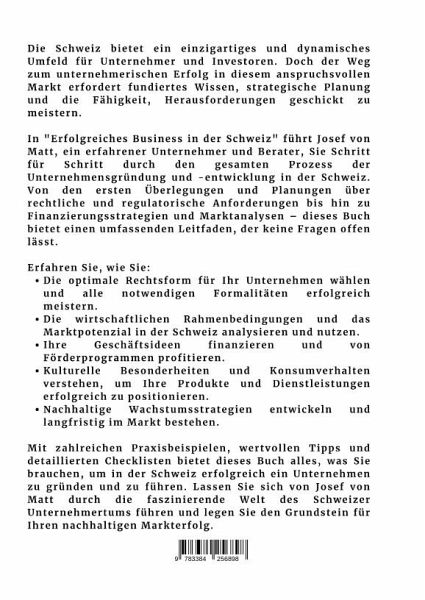 Die Schweiz bietet ein einzigartiges und dynamisches Umfeld für Unternehmer und Investoren. Doch der Weg zum unternehmerischen Erfolg in diesem anspruchsvollen Markt erfordert fundiertes Wissen, strategische Planung und die Fähigkeit, Herausforderungen geschickt zu meistern.In "Erfolgreiches Business in der Schweiz" führt Josef von Matt, ein erfahrener Unternehmer und Berater, Sie Schritt für Schritt durch den gesamten Prozess der Unternehmensgründung und -entwicklung in der Schweiz. Von den ersten Überlegungen und Planungen über rechtliche und regulatorische Anforderungen bis hin zu Finanzierungsstrategien und Marktanalysen - dieses Buch bietet einen umfassenden Leitfaden, der keine Fragen offen lässt.Erfahren Sie, wie Sie:_ Die optimale Rechtsform für Ihr Unternehmen wählen und alle notwendigen Formalitäten erfolgreich meistern._ Die wirtschaftlichen Rahmenbedingungen und das Marktpotenzial in der Schweiz analysieren und nutzen._ Ihre Geschäftsideen finanzieren und von Förderprogrammen profitieren._ Kulturelle Besonderheiten und Konsumverhalten verstehen, um Ihre Produkte und Dienstleistungen erfolgreich zu positionieren._ Nachhaltige Wachstumsstrategien entwickeln und langfristig im Markt bestehen.Mit zahlreichen Praxisbeispielen, wertvollen Tipps und detaillierten Checklisten bietet dieses Buch alles, was Sie brauchen, um in der Schweiz erfolgreich ein Unternehmen zu gründen und zu führen. Lassen Sie sich von Josef von Matt durch die faszinierende Welt des Schweizer Unternehmertums führen und legen Sie den Grundstein für Ihren nachhaltigen Markterfolg.