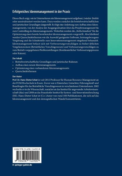 Dieses Buch zeigt, wie in Unternehmen ein Ideenmanagement aufgebaut, (wieder-)belebt oder umstrukturiert werden kann. Dazu werden zunächst die betriebswirtschaftlichen und juristischen Grundlagen dargestellt. Es folgt eine Anleitung zum Aufbau eines Ideenmanagements, von der Analyse der Ausgangssituation über das Projektmanagement bis zum Controlling des Ideenmanagements. Weiterhin werden die "Stellschrauben" für die Optimierung eines bereits bestehenden Ideenmanagements vorgestellt. Abschließend werden Querschnittsthemen wie die Auswahl geeigneter Software, leistungsbezogene Vergütung und die Schnittstelle zum Innovationsmanagement eingehend behandelt. Ideenmanagement befasst sich mit Verbesserungsvorschlägen zu bisher üblichen Vorgehensweisen (Betriebliches Vorschlagswesen) und Verbesserungsvorschlägen zu vom Betrieb vorgegebenen Problemstellungen (Kontinuierlicher Verbesserungsprozess oder Kaizen).