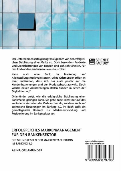 Der Unternehmenserfolg hängt maßgeblich von der erfolgreichen Etablierung einer Marke ab. Doch besonders Produkte und Dienstleistungen von Banken sind sich sehr ähnlich. Für den Endkunden erscheinen sie austauschbar.Kann auch eine Bank im Marketing auf Alleinstellungsmerkmale setzen? Alina Orlamünder erklärt in ihrer Publikation, dass sich das auch positiv auf die Kundenbeziehungen und den Produktabsatz auswirkt. Doch welche neuen Anforderungen stellen Kunden in Zeiten der Digitalisierung?Orlamünder zeigt, wie die erfolgreiche Etablierung einer Bankmarke gelingen kann. Sie geht dabei nicht nur auf das veränderte Verhalten der Verbraucher ein, sondern auch auf technische Neuerungen im Banking 4.0. Ihr Buch stellt ein grundlegendes Konzept zur Markenentwicklung und Positionierung im Bankensektor vor.Aus dem Inhalt:-Markenmanagement;-USP;-Unique Selling Proposition;-FinTech;-Industrie 4.0;-Digitalisierung;-Geschäftsmodell