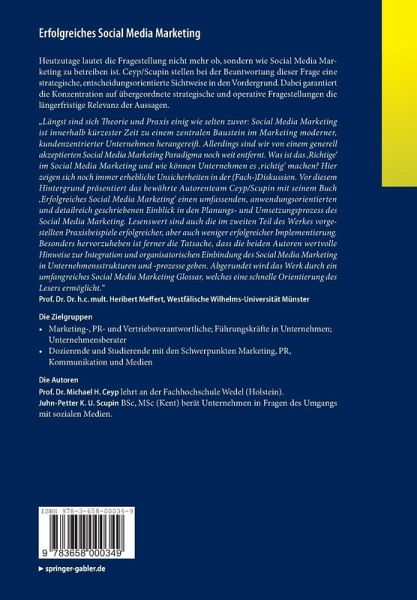 Prof. Dr. Michael H. Ceyp promovierte bei Prof. Dr. Dr. h.c. mult. H. Meffert. Danach folgte eine mehrjährige Tätigkeit als Consultant im Dialogmarketing, bevor er zu Rapp Collins Consulting, Hamburg, ging, wo er große und mittelständische Unternehmen in vielfältigen Fragestellungen des (internationalen) Dialogmarketings, Database Marketings, Online Marketings und CRMs beriet. Seit dem Sommersemester 2001 lehrt Prof. Dr. Ceyp an der privaten, staatlich anerkannten Fachhochschule Wedel (Holstein) bei Hamburg. Er gründete dort im Jahr 2003 den Fachbereich BWL mit seinem Forschungs- und Lehrschwerpunkt "Marketing". Im Bereich "Online Marketing" zählt Prof. Ceyp zu den seit über einem Jahrzehnt aktiven Protagonisten. Etliche Veröffentlichungen, Vorträge und Praxisprojekte belegen sein Engagement für Suchmaschinen-Marketing, Social Media Marketing und Co. Juhn-Petter K. U. Scupin BSc, MSc (Kent) ist ehemaliger Student von Prof. Dr. Ceyp und Absolvent der Fachhochschule Wedel. Seit seinem Auslandssemester an der University of Buckingham im Jahr 2008 beschäftigt er sich schwerpunktmäßig mit Social Media Marketing. Im Rahmen seiner Bachelor Thesis begann in Zusammenarbeit mit Prof. Dr. Ceyp die Entwicklung dieses Werkes, das ein strategisches Vorgehensmodells für Social Media Marketing bietet. Während seines Masterstudiums im Studiengang Marketing-Management an der University of Kent vertiefte er sein Wissen im Bereich Marketing. Ferner arbeitete er seit 2008 neben seinem Studium als Unternehmensberater für Online Marketing mit dem Schwerpunkt Social Media Marketing. Inzwischen übt er diese Tätigkeit hauptberuflich aus und berät große und mittelständische Unternehmen in Fragen des Umgangs mit sozialen Medien.