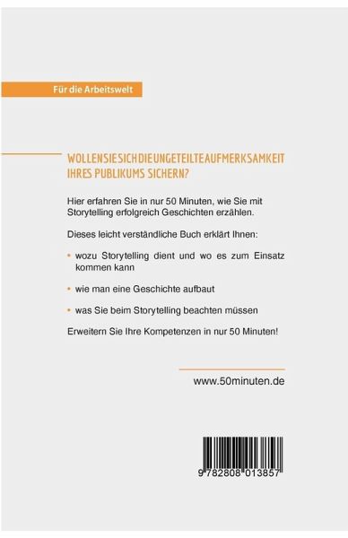 Mit Storytelling effektiv Geschichten erzählen ¿ in nur 50 Minuten Sie bewerben sich auf eine Stelle und wollen beim Vorstellungsgespräch aus der Masse herausstechen? Ihnen steht eine Produktpräsentation bevor, bei der Sie Ihre Kunden überzeugen müssen? Ihr Wunsch ist es, sowohl Ihre Mitarbeiter als auch Ihre Klienten besser an Ihr Unternehmen zu binden? Dann wird Storytelling Ihr Schlüssel zum Erfolg sein. In diesem Buch wird Ihnen diese Kommunikationstechnik erklärt und Schritt für Schritt nähergebracht, sodass Sie Ihr Publikum am Ende mit Ihren Ideen überzeugen und einen bleibenden Eindruck hinterlassen! Nach 50 Minuten können Sie: ¿ Storytelling privat und beruflich sicher anwenden ¿ eine effiziente Geschichte entwerfen ¿ die Geschichte erfolgreich vortragen Starten Sie mit diesen praktischen Tipps voll durch! Über 50MINUTEN.DE Für die Arbeitswelt Was bringt Sie im Job weiter? Die Serie Für die Arbeitswelt der Reihe 50Minuten ist für alle geeignet, die sich ¿ egal auf welchem Abschnitt ihrer Karriere ¿ neue persönliche und berufliche Kompetenzen aneignen, ihr Potenzial optimal ausschöpfen oder einfach ihre Work-Life-Balance hinterfragen wollen. Unsere kompakten Titel enthalten nicht nur eine von Experten erstellte Übersicht über die relevante Theorie, sondern auch konkrete Anleitungen, die von zahlreichen Beispielen unterstützt werden. Die einfache und leicht verständliche Formulierung der komplexen Sachverhalte ist somit der ideale Ausgangspunkt für Angestellte, Arbeitgeber und Arbeitssuchende.