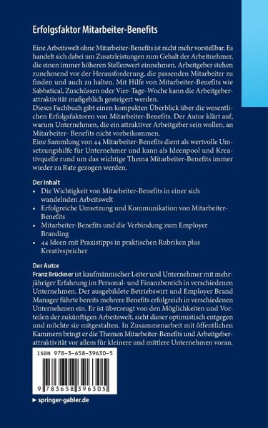 Eine Arbeitswelt ohne Mitarbeiter-Benefits ist nicht mehr vorstellbar. Es handelt sich dabei um Zusatzleistungen zum Gehalt der Arbeitnehmer, die einen immer höheren Stellenwert einnehmen. Arbeitgeber stehen zunehmend vor der Herausforderung, die passenden Mitarbeiter zu finden und auch zu halten. Mit Hilfe von Mitarbeiter-Benefits wie Sabbatical, Zuschüssen oder Vier-Tage-Woche kann die Arbeitgeberattraktivität maßgeblich gesteigert werden. Dieses Fachbuch gibt einen kompakten Überblick über die wesentlichen Erfolgsfaktoren von Mitarbeiter-Benefits. Der Autor klärt auf, warum Unternehmen, die ein attraktiver Arbeitgeber sein wollen, an Mitarbeiter-Benefits nicht vorbeikommen. Eine Sammlung von 44 Mitarbeiter-Benefits dient als wertvolle Umsetzungshilfe für Unternehmer und kann als Ideenpool und Kreativquelle rund um das wichtige Thema Mitarbeiter-Benefits immer wieder zu Rate gezogen werden.