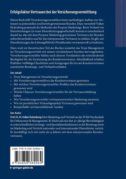 Trust Management im Versicherungsvertrieb.- Versicherungsvermittler als Human Touchpoint des Vertrauens.- Wie Versicherungsvermittler das Kundenvertrauen gewinnen.- Welche Profile der Versicherungsvermittler Vertrauen fördern.- Welche Chancen Versicherungsvermittler für die Vertrauensbildung haben.- Welche Vertrauenpotenziale Versicherungsvermittler haben.- Wie Versicherungsvermittler Trust Management mit Marketing realisieren.- Wie im persönlichen Verkauf Vertrauen gewonnen wird.- Beispielhafte Vertrauensaktivitäten aus der Praxis.