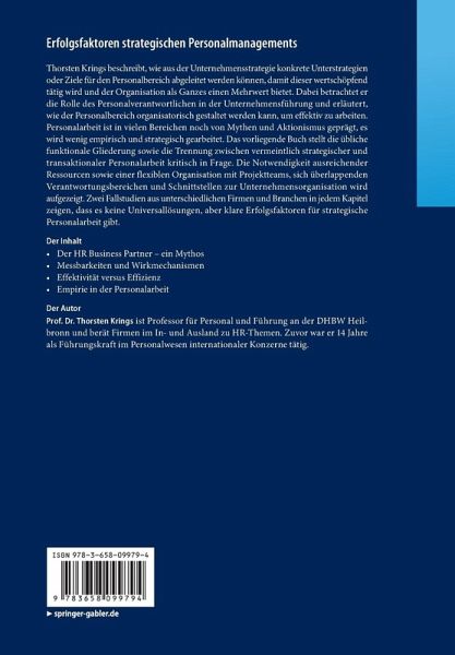 Thorsten Krings beschreibt, wie aus der Unternehmensstrategie konkrete Unterstrategien oder Ziele für den Personalbereich abgeleitet werden können, damit dieser wertschöpfend tätig wird und der Organisation als Ganzes einen Mehrwert bietet. Dabei betrachtet er die Rolle des Personalverantwortlichen in der Unternehmensführung und erläutert, wie der Personalbereich organisatorisch gestaltet werden kann, um effektiv zu arbeiten. Personalarbeit ist in vielen Bereichen noch von Mythen und Aktionismus geprägt, es wird wenig empirisch und strategisch gearbeitet. Das vorliegende Buch stellt die übliche funktionale Gliederung sowie die Trennung zwischen vermeintlich strategischer und transaktionaler Personalarbeit kritisch in Frage. Die Notwendigkeit ausreichender Ressourcen sowie einer flexiblen Organisation mit Projektteams, sich überlappenden Verantwortungsbereichen und Schnittstellen zur Unternehmensorganisation wird aufgezeigt. Zwei Fallstudien aus unterschiedlichen Firmen und Branchenin jedem Kapitel zeigen, dass es keine Universallösungen, aber klare Erfolgsfaktoren für strategische Personalarbeit gibt.