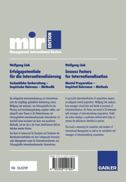Die erfolgreiche Internationalisierung von Unternehmen setzt die sorgfältige gedankliche Vorbereitung einzelner Internationalisierungsschritte voraus. Wolfgang Link analysiert, wie Führungskräfte bei der Planung und Entscheidungsfindung vorgehen sollten, und überprüft seine Thesen in 36 Tiefeninterviews mit Führungskräften internationalisierender Unternehmen. Im Anschluß daran konzipiert der Autor eine qualitative Methodik, mit deren Hilfe die in der Praxis identifizierten Defizite behoben werden können. Verzeichnis: Wolfgang Link analysiert, wie Führungskräfte bei der Planung und Entscheidungsfindung vorgehen sollten, und überprüft seine Thesen in Tiefeninterviews mit Führungskräften internationalisierender Unternehmen.