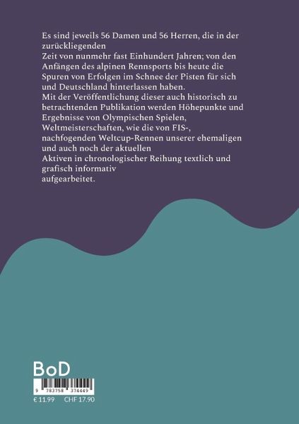 Es sind jeweils 56 Damen und 56 Herren, die in der zurückliegendenZeit von nunmehr fast Einhundert Jahren; von den Anfängen des alpinen Rennsports bis heute die Spuren von Erfolgen im Schnee der Pisten für sich und Deutschland hinterlassen haben.Mit der Veröffentlichung dieser auch historisch zu betrachtenden Publikation werden Höhepunkte und Ergebnisse von Olympischen Spielen, Weltmeisterschaften, wie die von FIS-, nachfogenden Weltcup-Rennen unserer ehemaligen und auch noch der aktuellenAktiven in chronologischer Reihung textlich und grafisch informativaufgearbeitet.