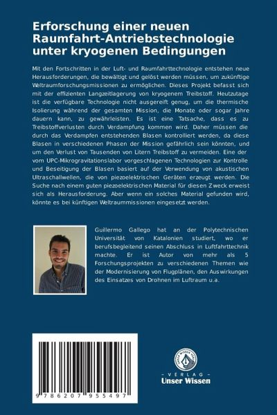 Mit den Fortschritten in der Luft- und Raumfahrttechnologie entstehen neue Herausforderungen, die bewältigt und gelöst werden müssen, um zukünftige Weltraumforschungsmissionen zu ermöglichen. Dieses Projekt befasst sich mit der effizienten Langzeitlagerung von kryogenem Treibstoff. Heutzutage ist die verfügbare Technologie nicht ausgereift genug, um die thermische Isolierung während der gesamten Mission, die Monate oder sogar Jahre dauern kann, zu gewährleisten. Es ist eine Tatsache, dass es zu Treibstoffverlusten durch Verdampfung kommen wird. Daher müssen die durch das Verdampfen entstehenden Blasen kontrolliert werden, da diese Blasen in verschiedenen Phasen der Mission gefährlich sein könnten, und um den Verlust von Tausenden von Litern Treibstoff zu vermeiden. Eine der vom UPC-Mikrogravitationslabor vorgeschlagenen Technologien zur Kontrolle und Beseitigung der Blasen basiert auf der Verwendung von akustischen Ultraschallwellen, die von piezoelektrischen Geräten erzeugt werden. Die Suche nach einem guten piezoelektrischen Material für diesen Zweck erweist sich als Herausforderung. Aber wenn ein solches Material gefunden wird, könnte es bei künftigen Weltraummissionen eingesetzt werden.