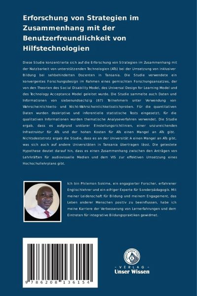 Diese Studie konzentrierte sich auf die Erforschung von Strategien im Zusammenhang mit der Nutzbarkeit von unterstützenden Technologien (ATs) bei der Umsetzung von inklusiver Bildung bei sehbehinderten Dozenten in Tansania. Die Studie verwendete ein konvergentes Forschungsdesign im Rahmen eines gemischten Forschungsansatzes, der von den Theorien des Social Disability Model, des Universal Design for Learning Model und des Technology Acceptance Model geleitet wurde. Die Studie sammelte auch Daten und Informationen von siebenundsechzig (67) Teilnehmern unter Verwendung von Wahrscheinlichkeits- und Nicht-Wahrscheinlichkeitsstichproben. Für die quantitativen Daten wurden deskriptive und inferentielle statistische Tests eingesetzt, für die qualitativen Informationen wurden thematische Analyseverfahren verwendet. Die Studie ergab, dass es aufgrund unklarer Einstellungsrichtlinien, einer unzureichenden Infrastruktur für ATs und der hohen Kosten für ATs einen Mangel an ATs gibt. Nichtsdestotrotz ergab die Studie, dass es an der Universität A einen Mangel an ATs gibt, was sich auch auf andere Universitäten in Tansania übertragen lässt. Die getestete Hypothese deutet darauf hin, dass es einen Zusammenhang zwischen den Anträgen von Lehrkräften für audiovisuelle Medien und dem VIS zur effektiven Umsetzung eines Hochschullehrplans gibt.